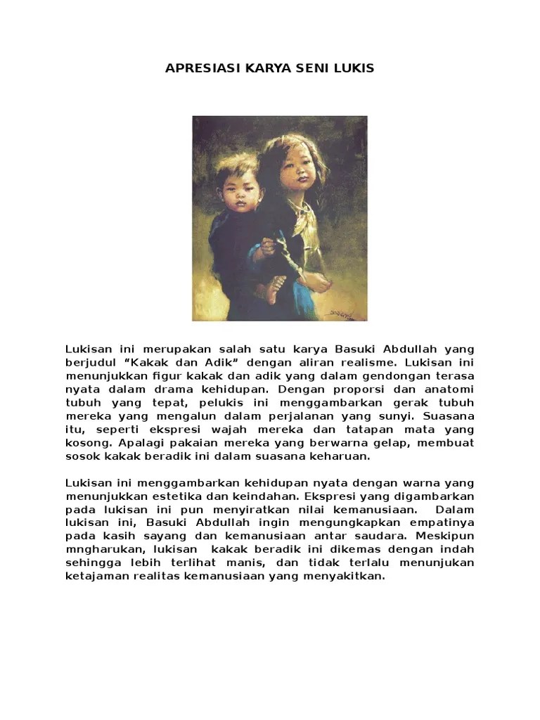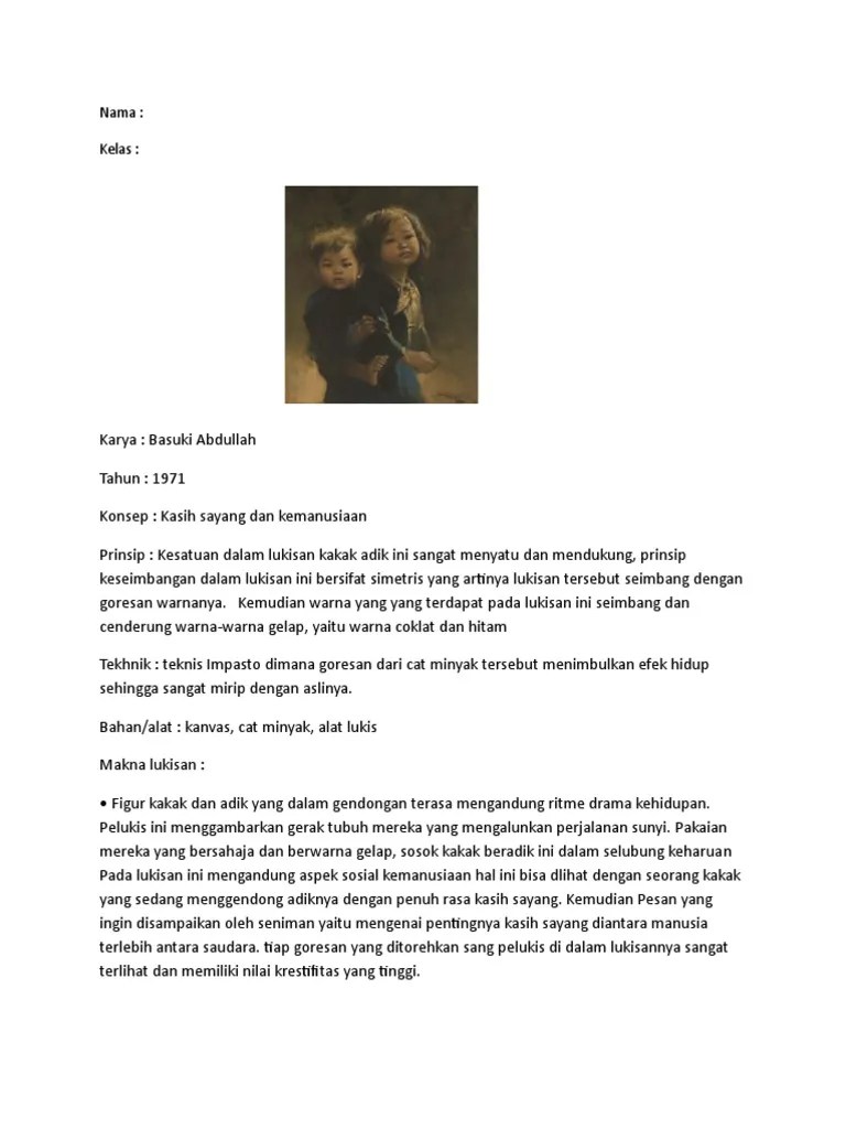 Ia dikenal sebagai pelukis aliran realis dan naturalis. Mengambil subjek matter seorang kakak perempuan yang sedang . Lukisan basuki abdullah yang berjudul kakak dan adik (1978) ini merupakan. Lukisan basuki abdullah dan maknanya. Lukisan kakak dan adik karya basoeki abdullah (1978).